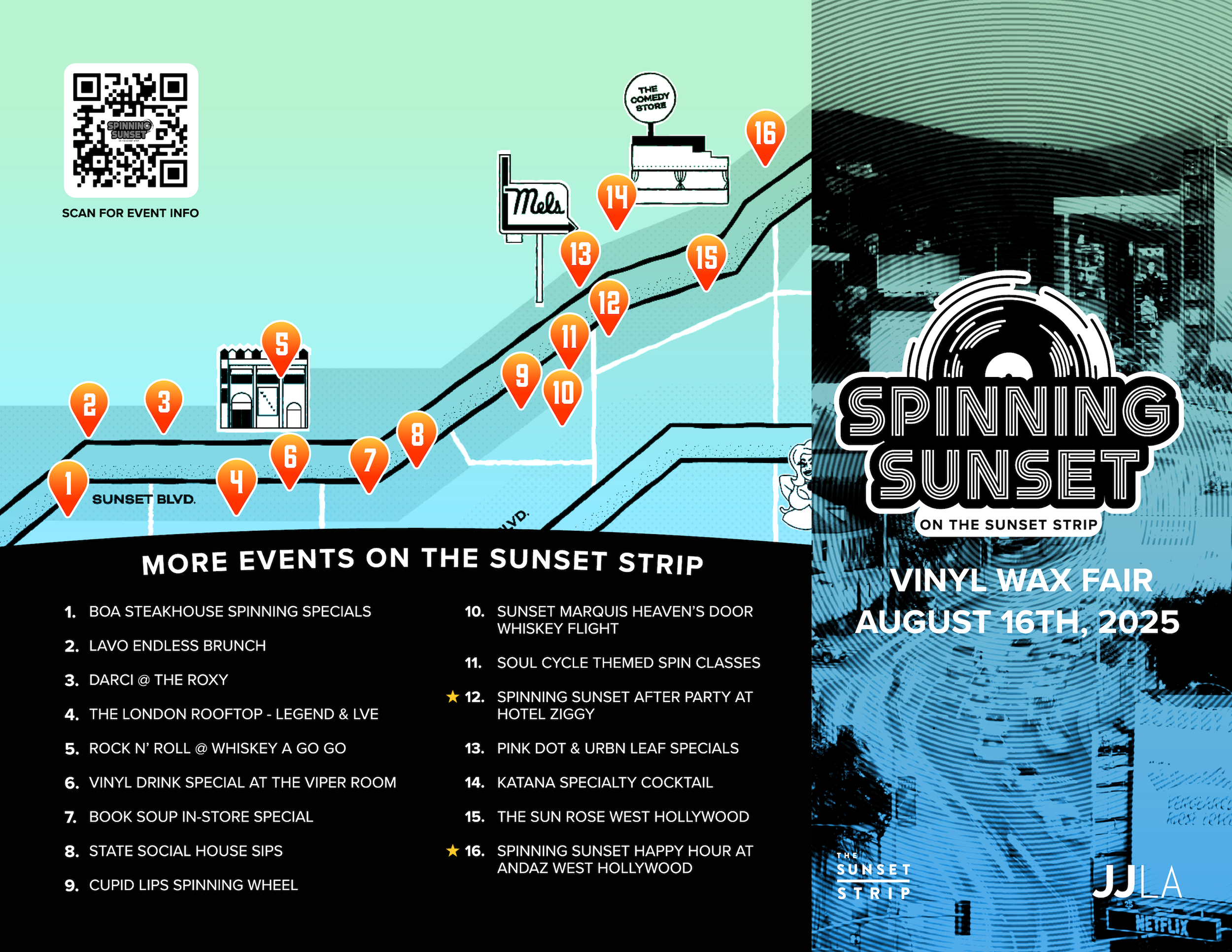 To celebrate the rich history and lore of the iconic 1.7-mile strip, the Sunset Strip hosted a vinyl fair. Part of the Strip’s annual Summer on Sunset initiative, the free, family-friendly event featured vinyl DJ sets, brand activations, and over 50 booths from local record stores and vintage vendors. Businesses like Hotel Ziggy, Andaz West Hollywood, and Book Soup also offered discounts, vinyl-themed specials, and pop-ups throughout the day.